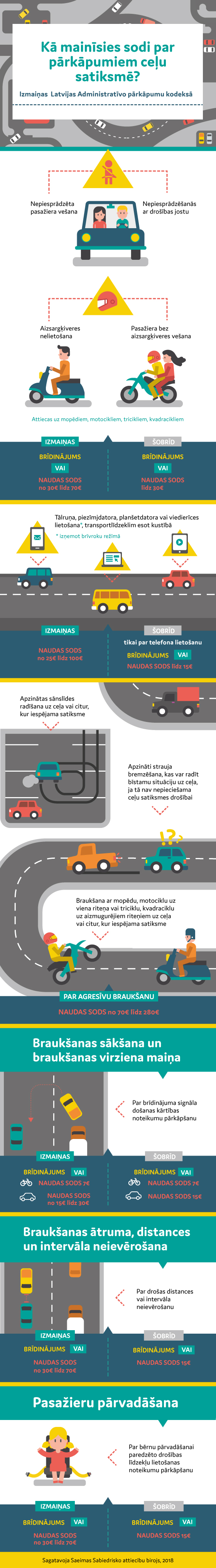 Infografika par to, kā mainīsies sodi par pārkāpumiem ceļu satiksmē. Izmaiņas Latvijas Administratīvo pārkāpumu kodeksā